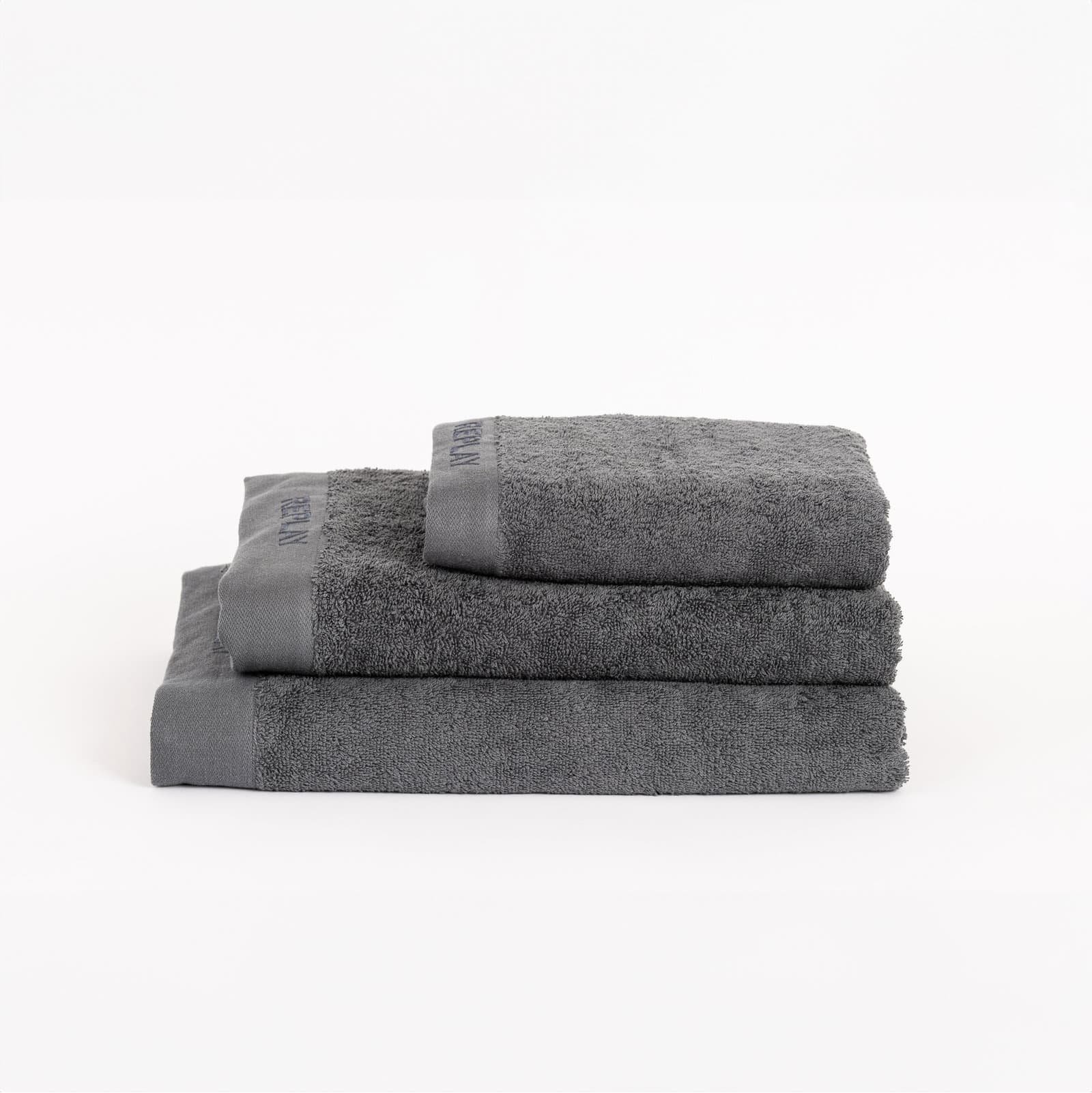 מגבת אפור כהה REPLAY בעיצוב אלגנטי ומודרני, עשויה מבד רך וסופג במיוחד שמעניק ייבוש מהיר ומגע מפנק אחרי כל שימוש.